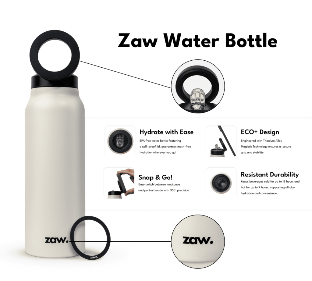 The ZAW Water Bottle is a versatile tool that combines hydration with mobile support for the modern lifestyle.